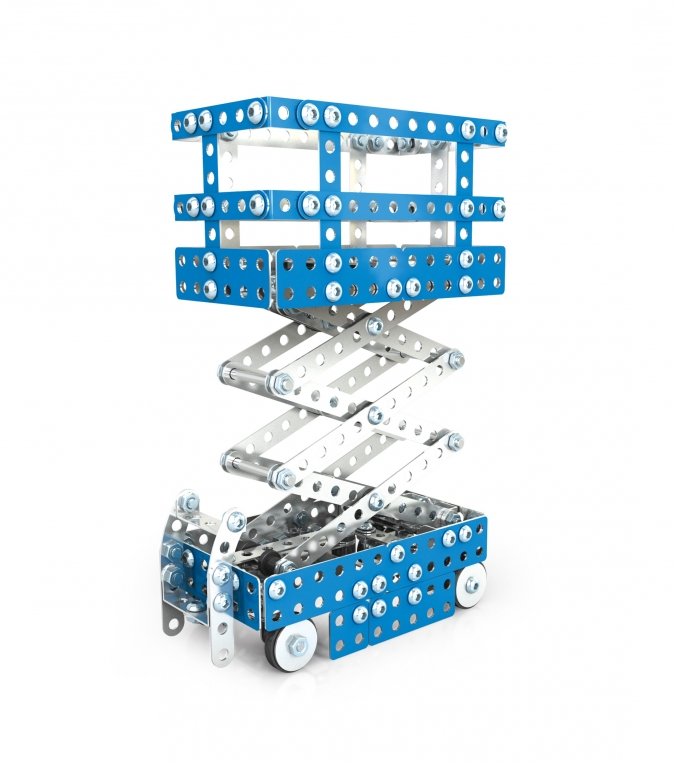 De hoogwerker heeft een platform die je omhoog kan zetten en stuurbare wielen.